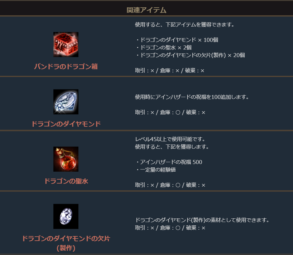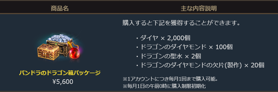ダイヤと一緒に、「ドラゴンのダイヤモンド」や「ドラゴンのダイヤモンドの欠片(製作)」と一緒に「ドラゴンの聖水」が手に入るお得なパッケージです。