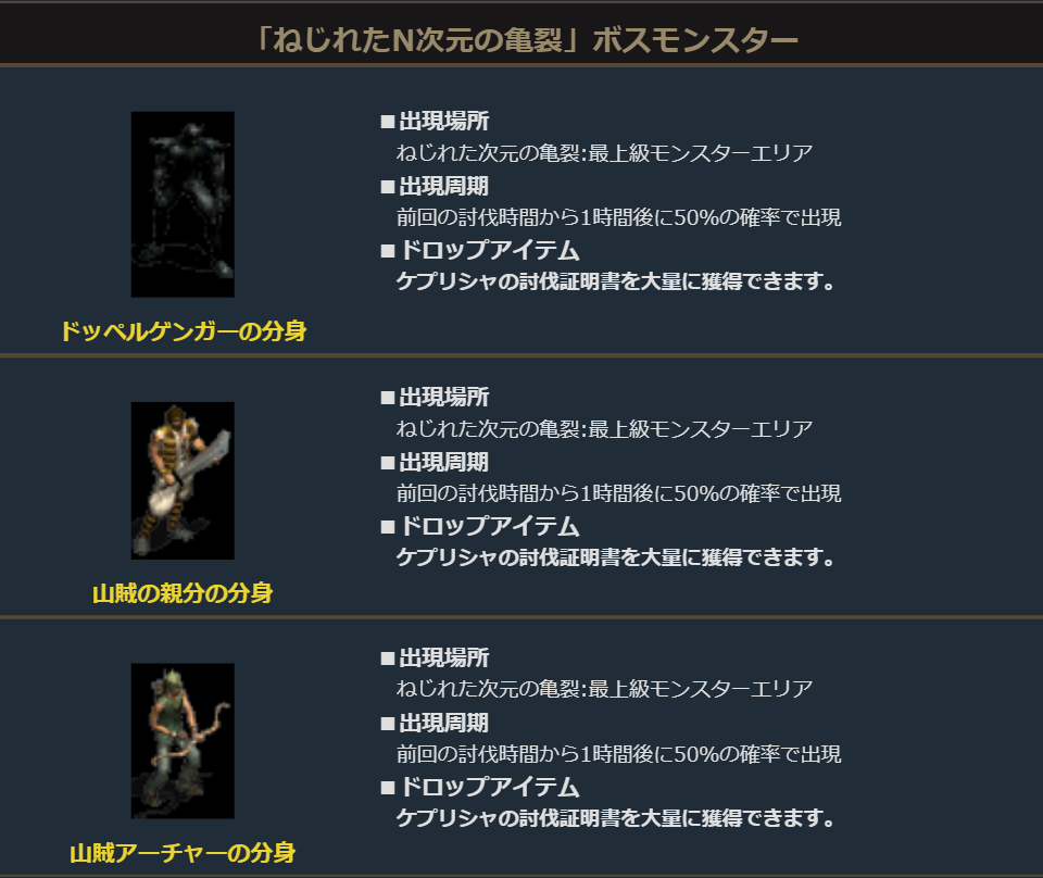 「ねじれたN次元」のモンスターを討伐すると、イベントアイテム「ケプリシャの討伐証明書」や、各種強化の巻物などが入手できます。
