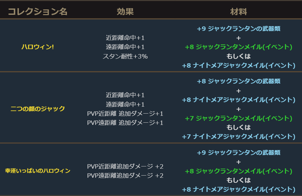 ハロウィンイベント商人からは強化することでイベントコレクションに登録することができる各種イベント防具やイベント武器を手に入れる事が出来るアイテムを購入することができます。