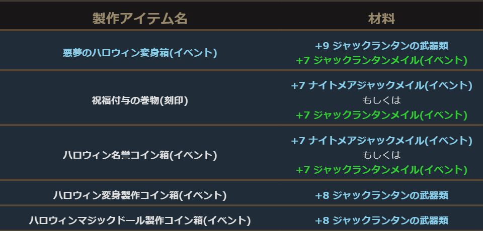 ▼ハロウィンイベント製作アイテム詳細