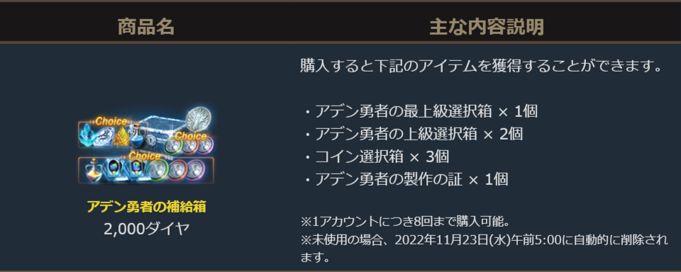 2022年10月26日より販売を開始しました「アデン勇者の補給箱」のご案内を申し上げます。