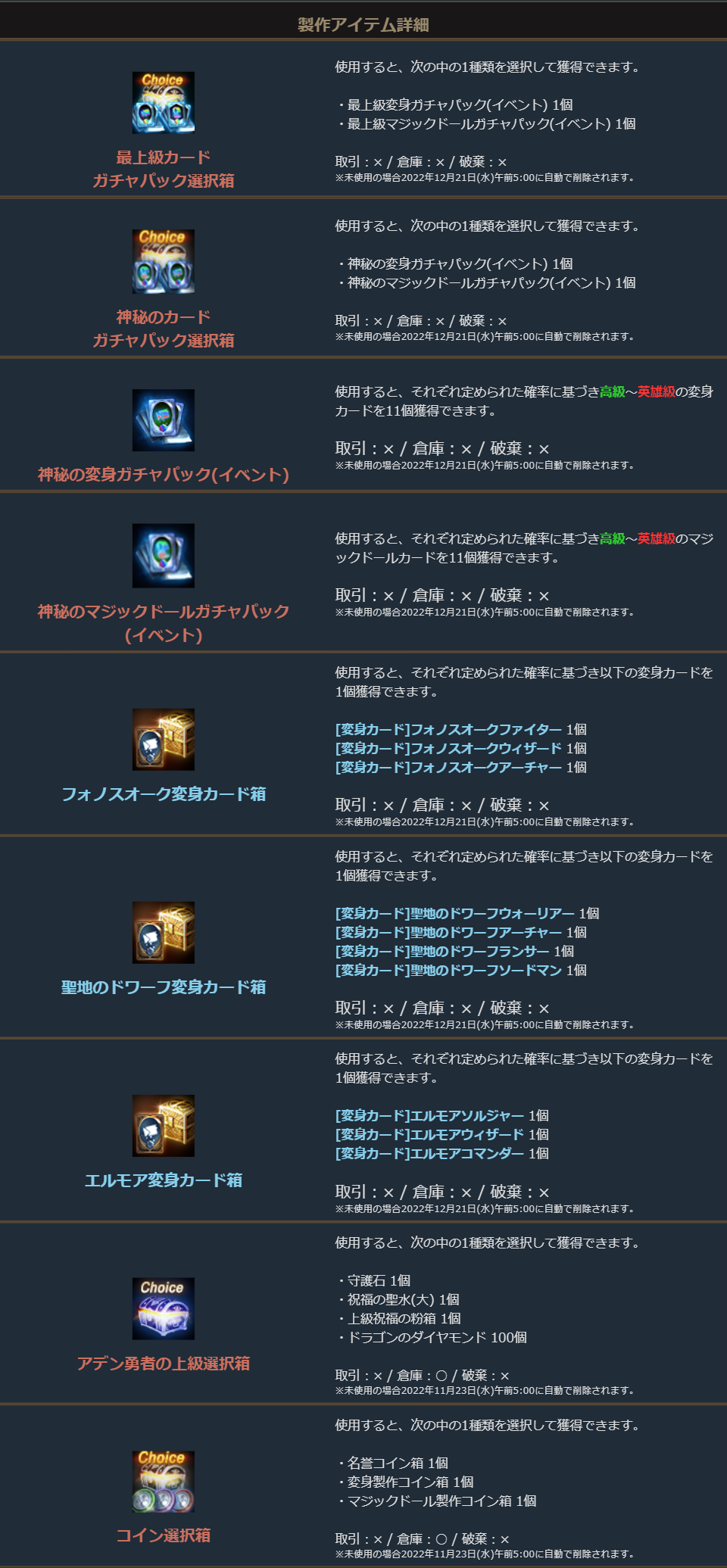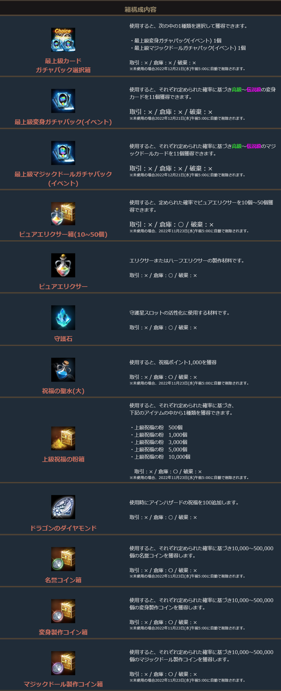 ※一部アイテムは未使用の場合、一定期間が経過すると自動で削除されます。詳しくは各アイテムの詳細をご確認ください。