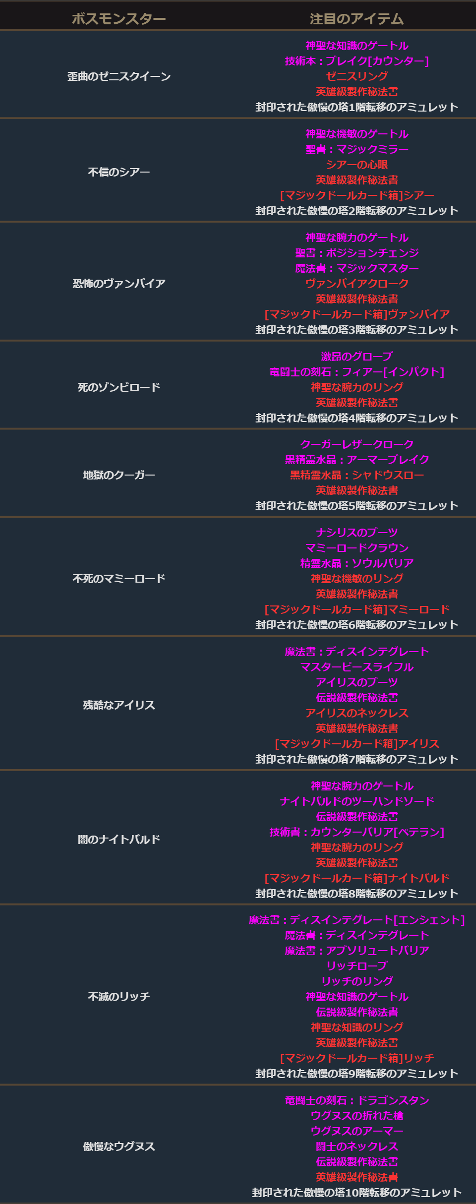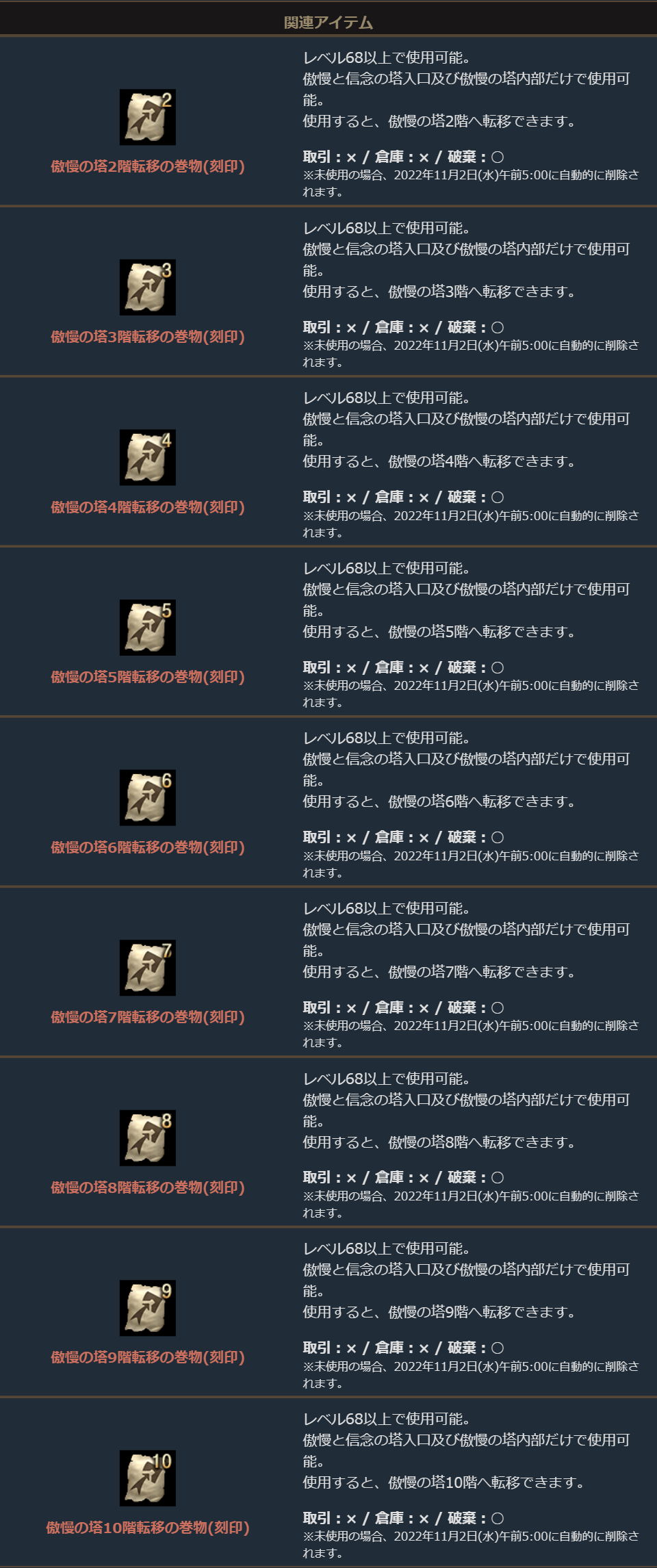・イベント期間中毎日12時00分に「傲慢の塔2階転移の巻物(刻印)」~「傲慢の塔10階転移の巻物(刻印)」を各1枚ずつ配布致します。