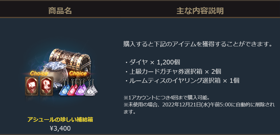 ダイヤと上級ガチャ券、装身具がセットになったお得なパッケージです。