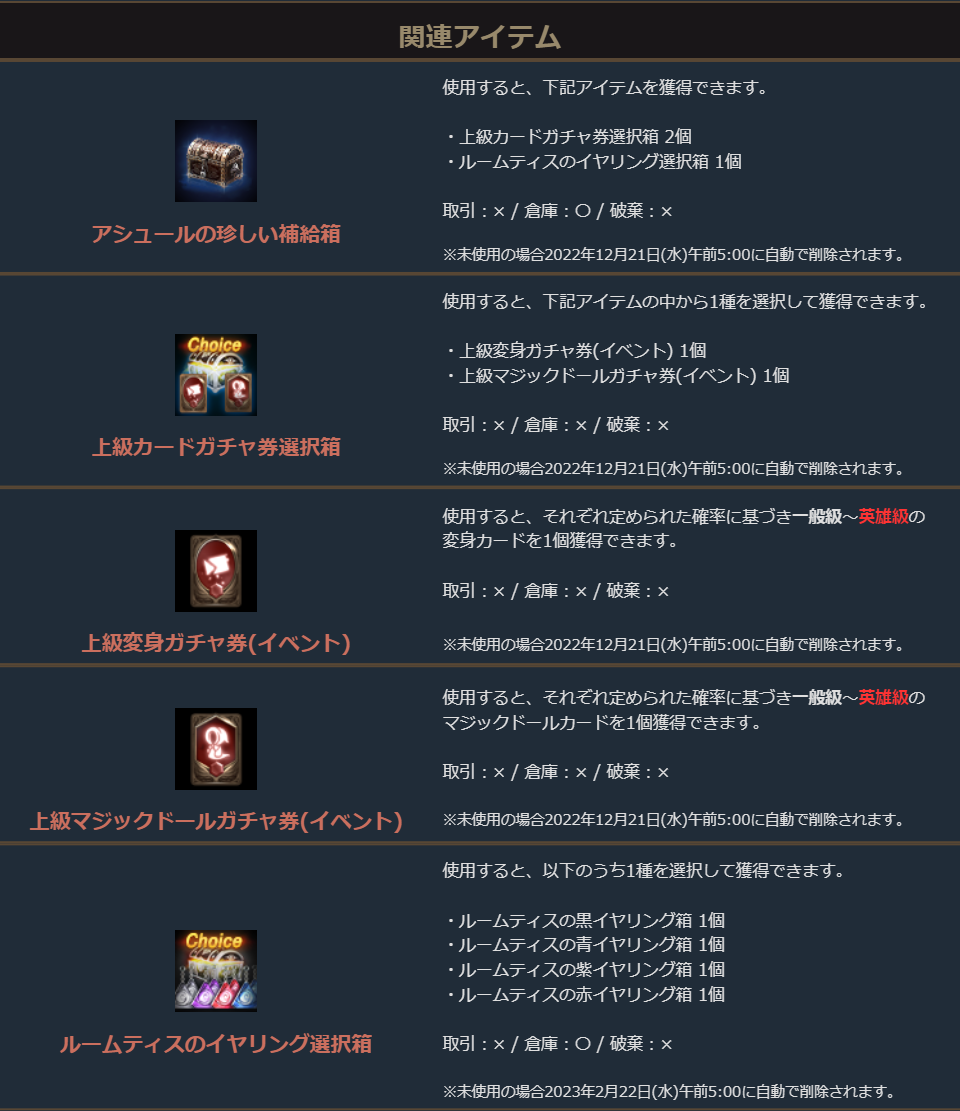 ※一部アイテムは未使用の場合、一定期間が経過すると自動で削除されます。詳しくは各アイテムの詳細をご確認ください。