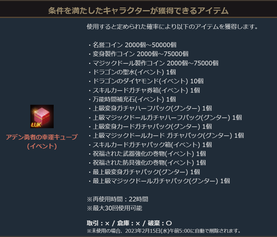 ※期間限定育成サーバー「グンター」のキャラクター情報は、2023年1月18日(水)メンテナンス時に全て削除いたします。