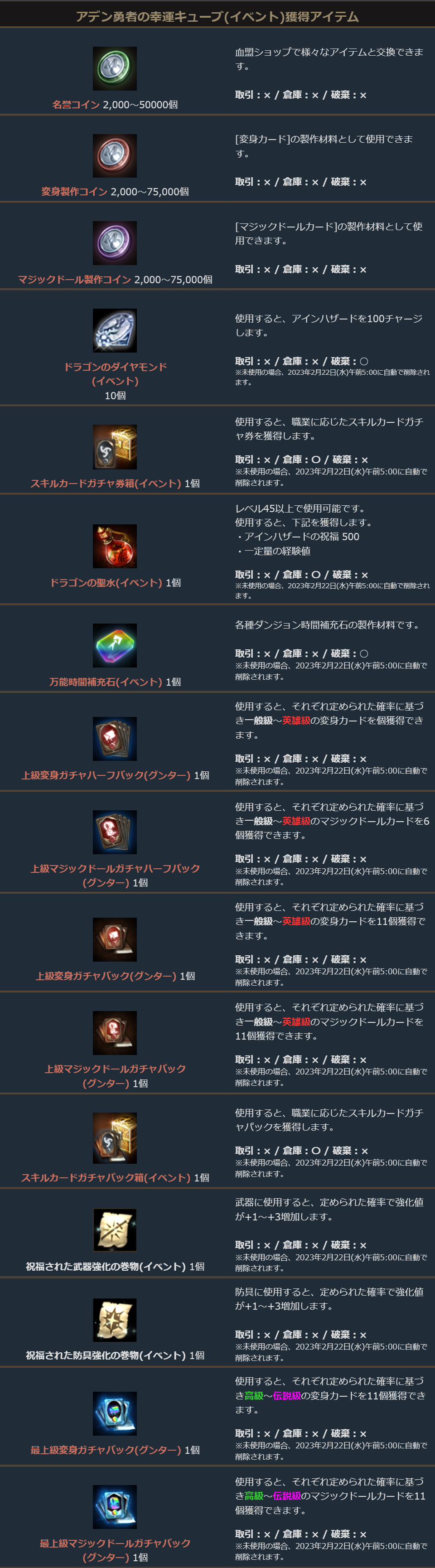 └取引可能な 7個以上の武器/15個以上の防具/10個以上の装身具 及び 5億以上のアデナ