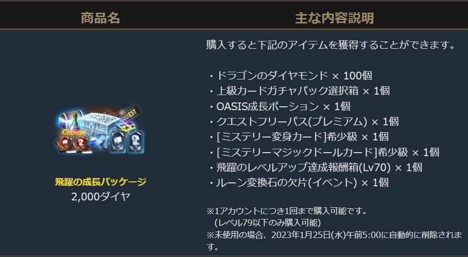 Lv80到達まで経験値ボーナス+1,200%になる「OASIS成長ポーション」や、希少級合成に挑戦して英雄級カード獲得が狙え、失敗しても希少級カードが獲得できるミステリーカードなど、その他キャラクター育成を強力に支援するアイテムが盛りだくさんのパッケージとなります。
