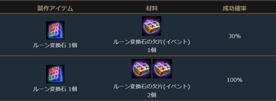「ルーン変換石の欠片(イベント)」を材料にして、以下のアイテムを製作することができます。