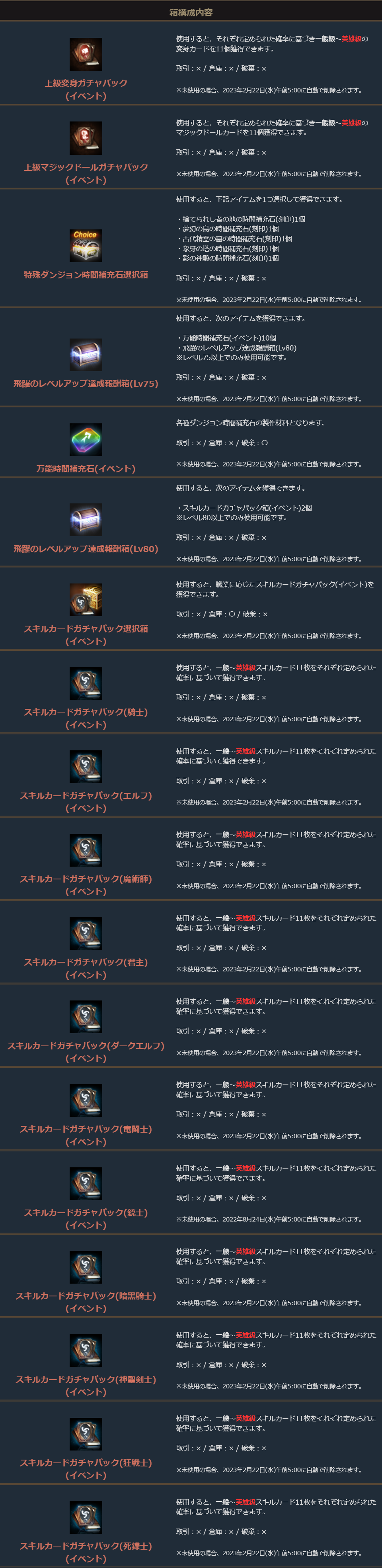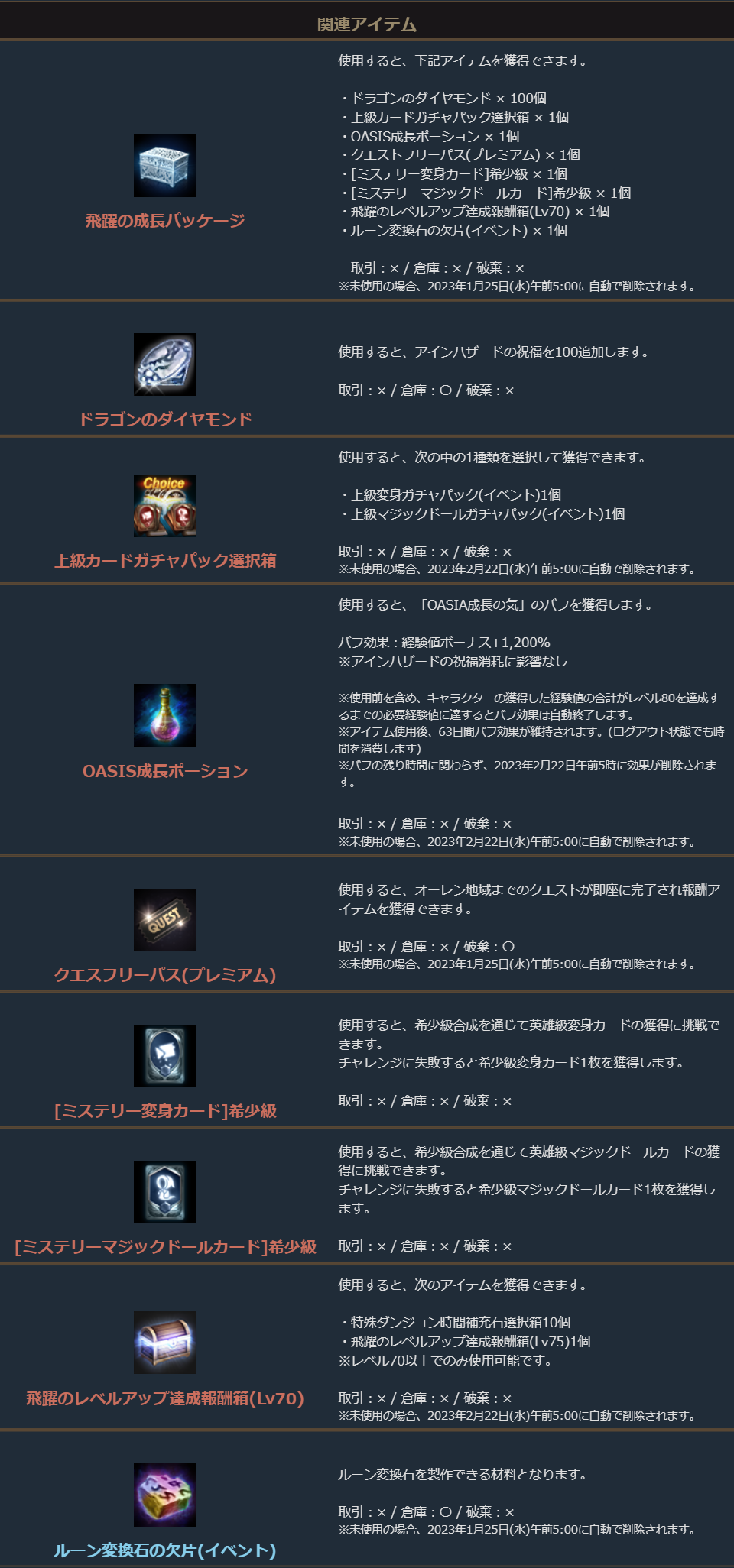 ※一部アイテムは未使用の場合、一定期間が経過すると自動で削除されます。詳しくは各アイテムの詳細をご確認ください。