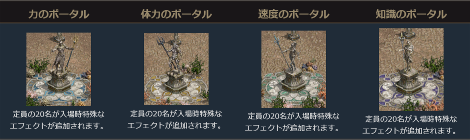 アトランティス中央にあるポセイドン神殿周辺には4つの銅像があり、それぞれがポセイドン神殿への入場ポータルとなっています。