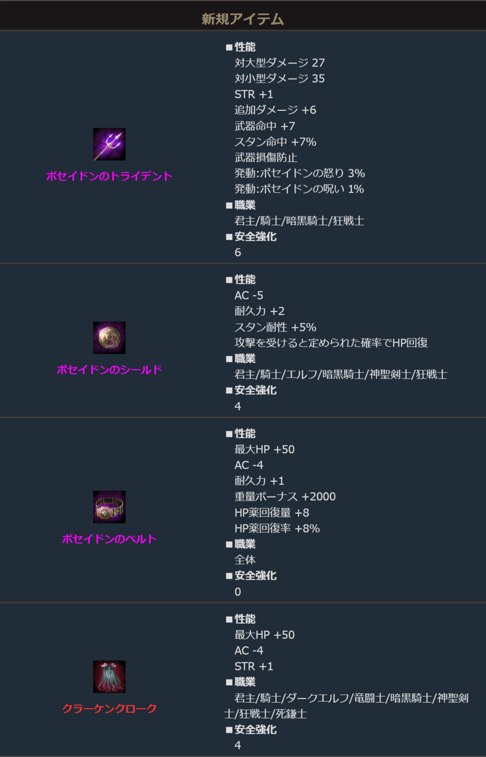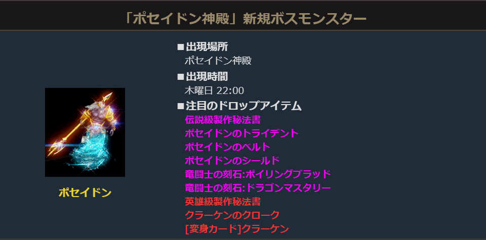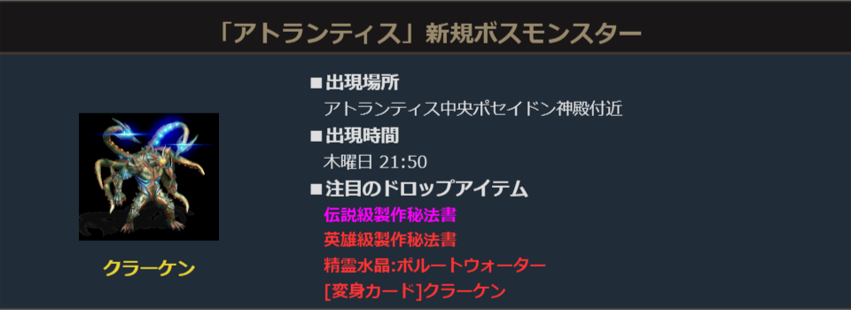 アトランティスでは下記のボスモンスターが出現し、新規アイテム「ポセイドンのトライデント」等の様々な貴重なアイテムをドロップします。