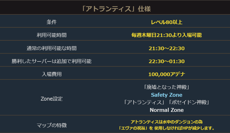 アトランティスは毎週木曜日の21時30分より入場が可能になるワールドダンジョンです。