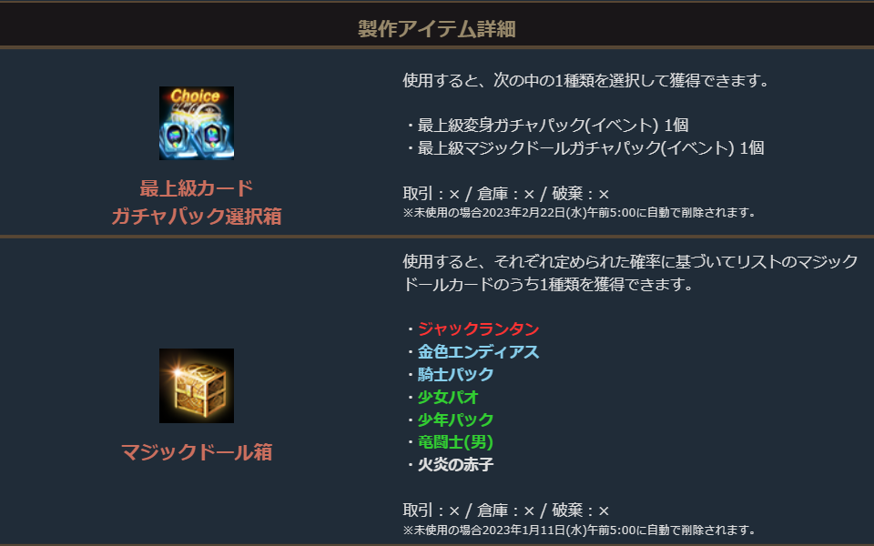 ※一部アイテムは未使用の場合、一定期間が経過すると自動で削除されます。詳しくは各アイテムの詳細をご確認ください。