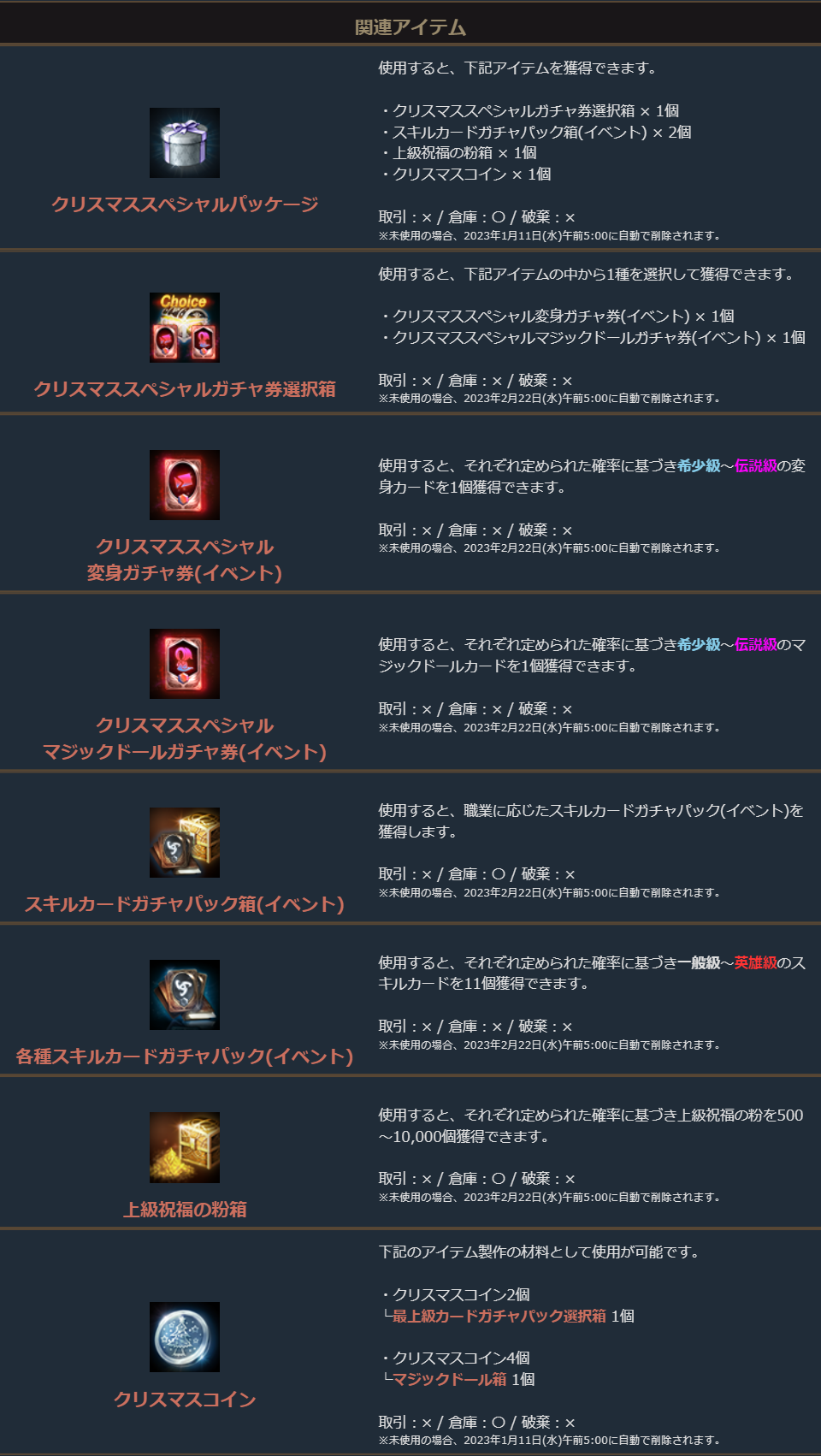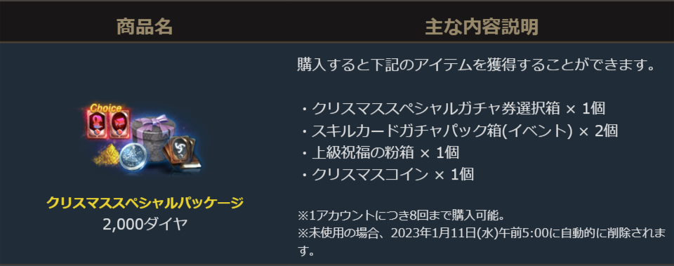 希少級以上のカードが獲得できる「クリスマススペシャルガチャ券選択箱」や製作に使用できる「クリスマスコイン」など様々なアイテムが手に入るパッケージです。