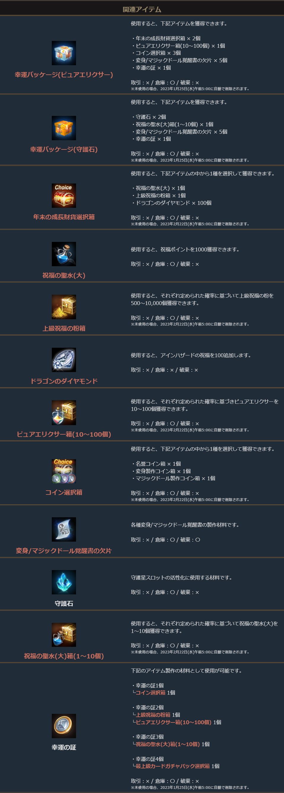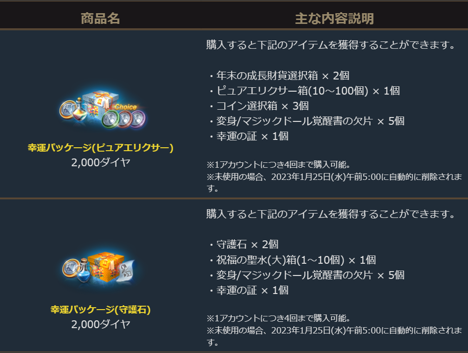 「変身/マジックドール覚醒書の欠片」や「年末の成長財貨選択箱」「守護石」といったアイテムに加え、成長に便利な各種アイテムが入った箱が製作できる「幸運の証」が手に入るお得なパッケージです。