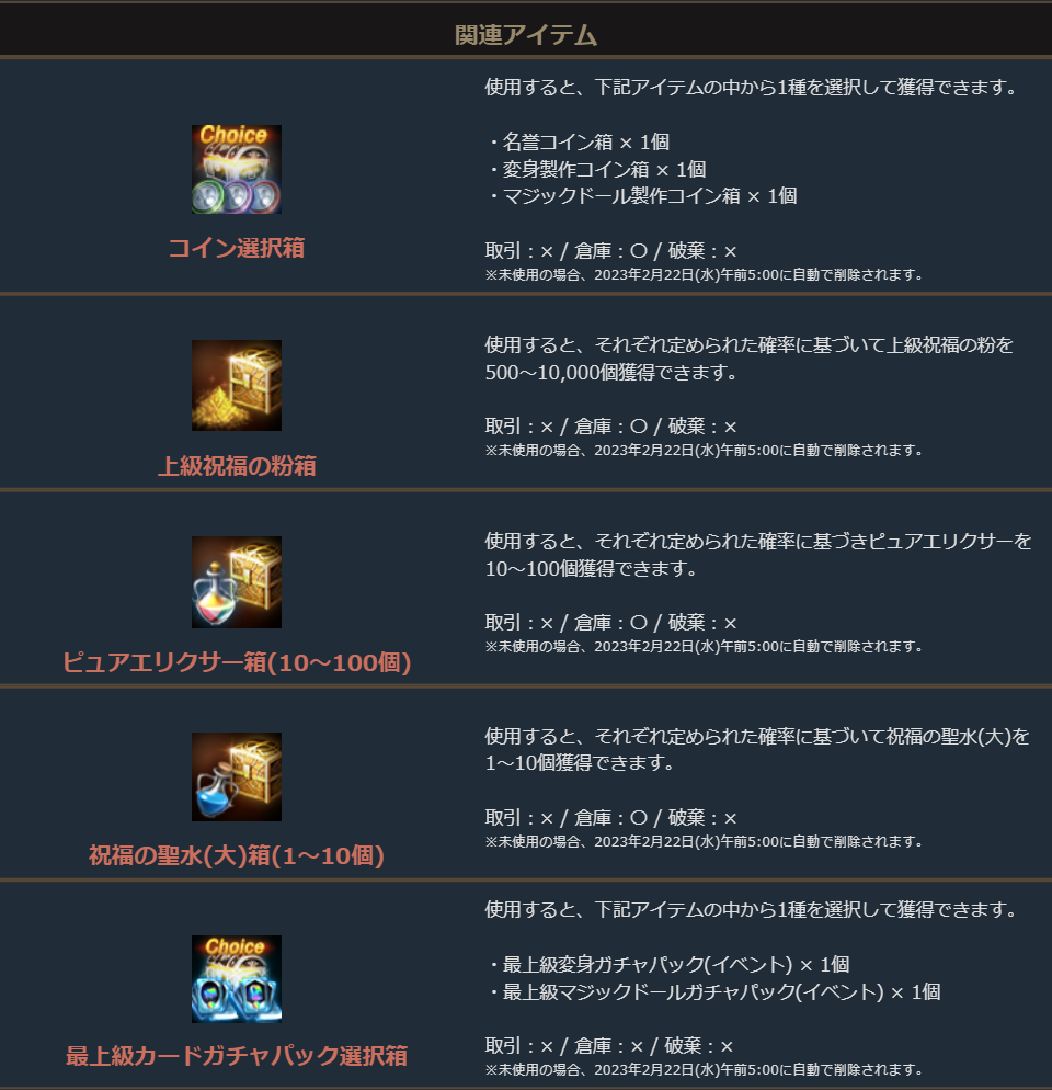 ※一部アイテムは未使用の場合、一定期間が経過すると自動で削除されます。詳しくは各アイテムの詳細をご確認ください。