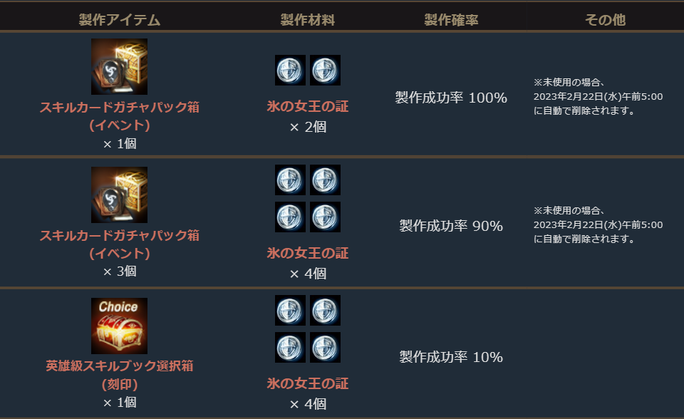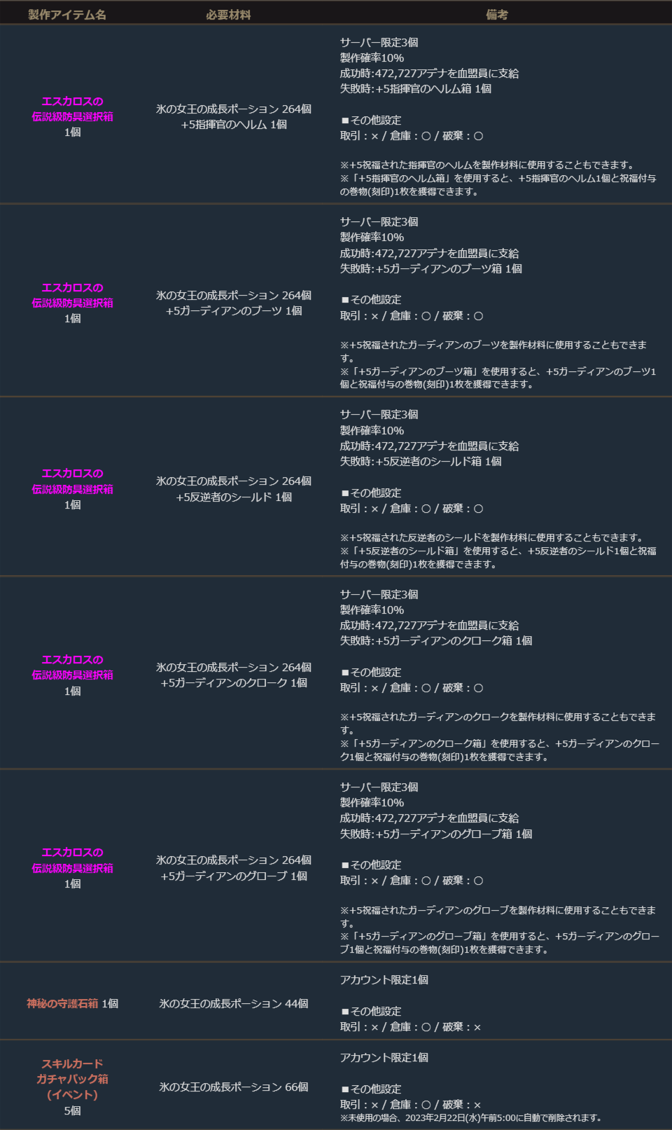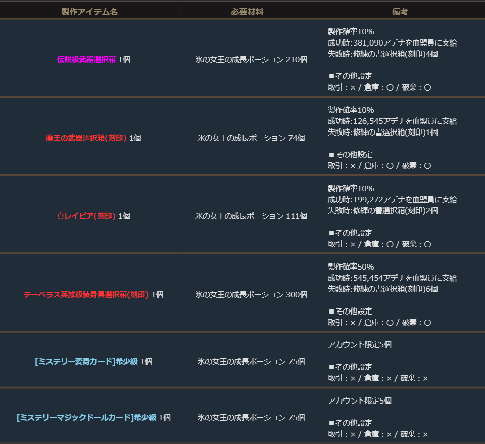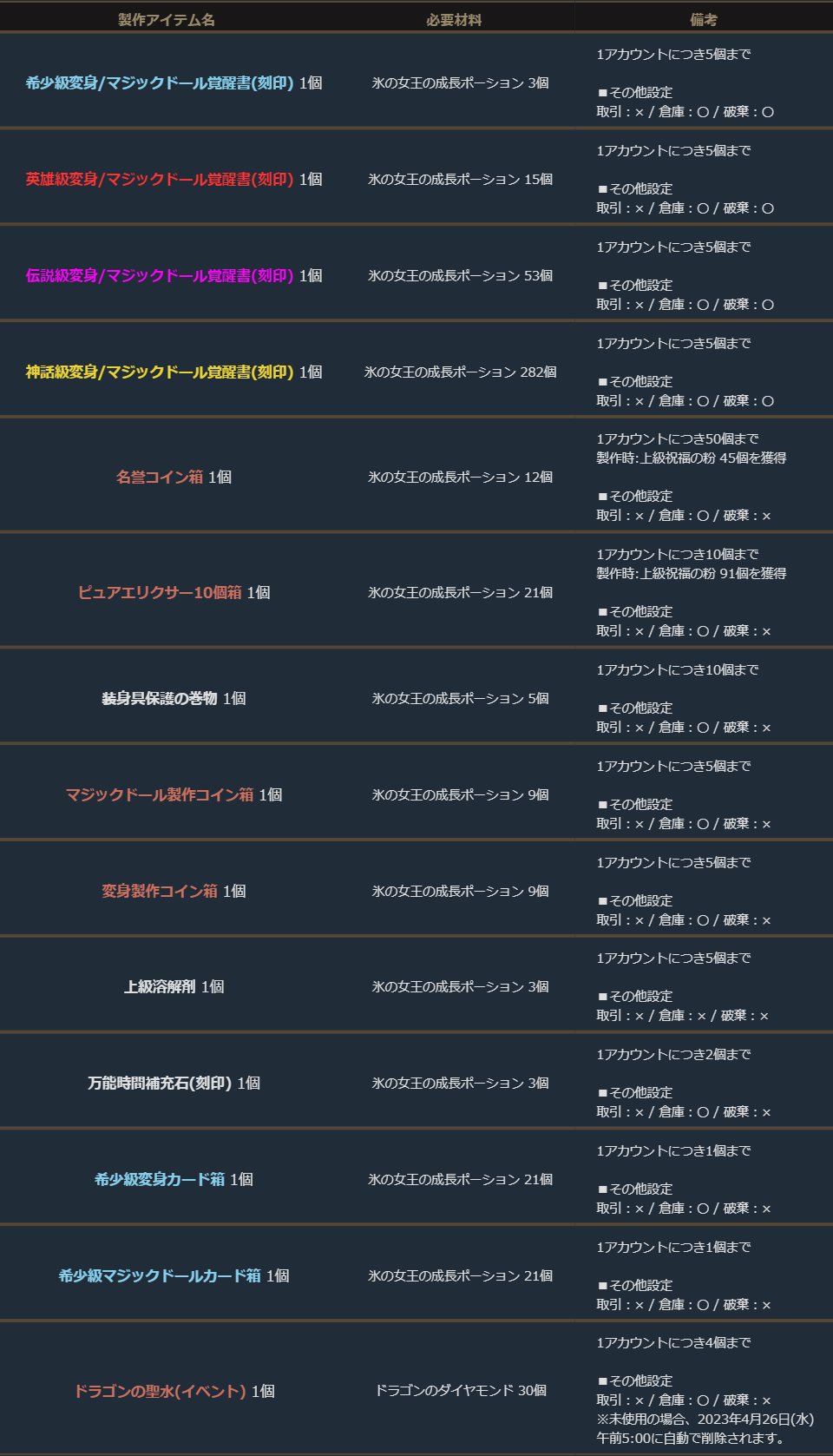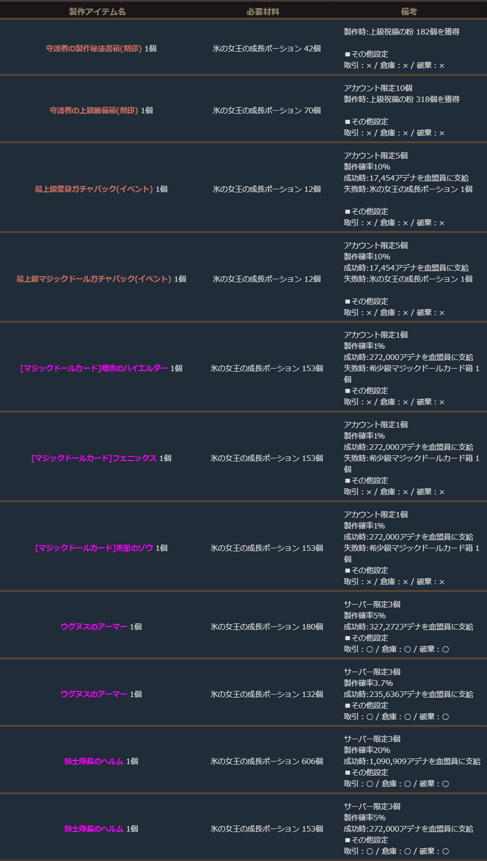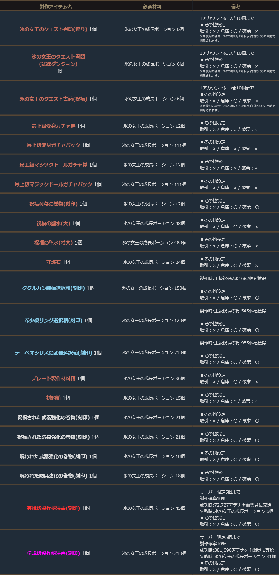 期間中、「氷の女王の成長ポーション」を使用して、下記の製作を行うことができます。