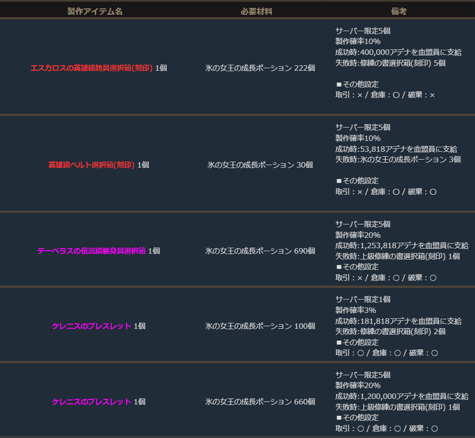 ※サーバー数量限定の製作アイテムは、各サーバーで製作できる数量に上限があります。
