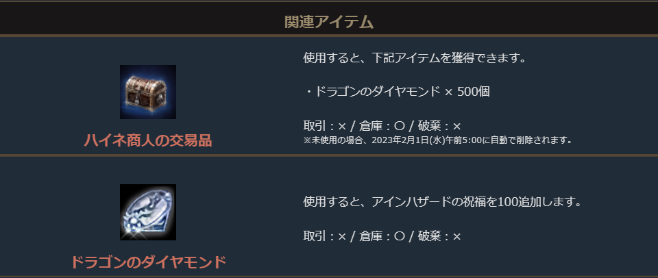 ※一部アイテムは未使用の場合、一定期間が経過すると自動で削除されます。詳しくは各アイテムの詳細をご確認ください。