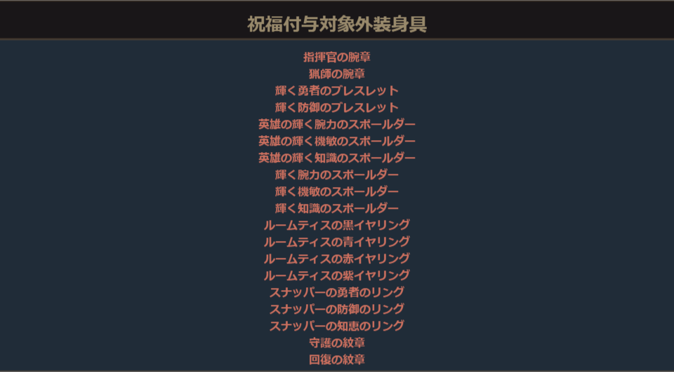 また、以下の装身具は「祝福付与の巻物」を使用して祝福付与をする事が出来ません。