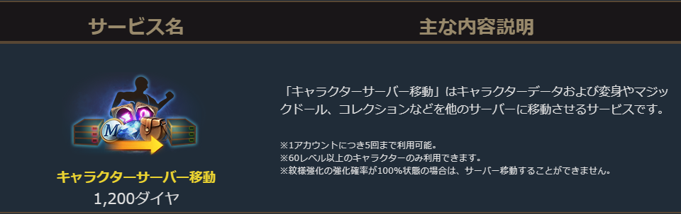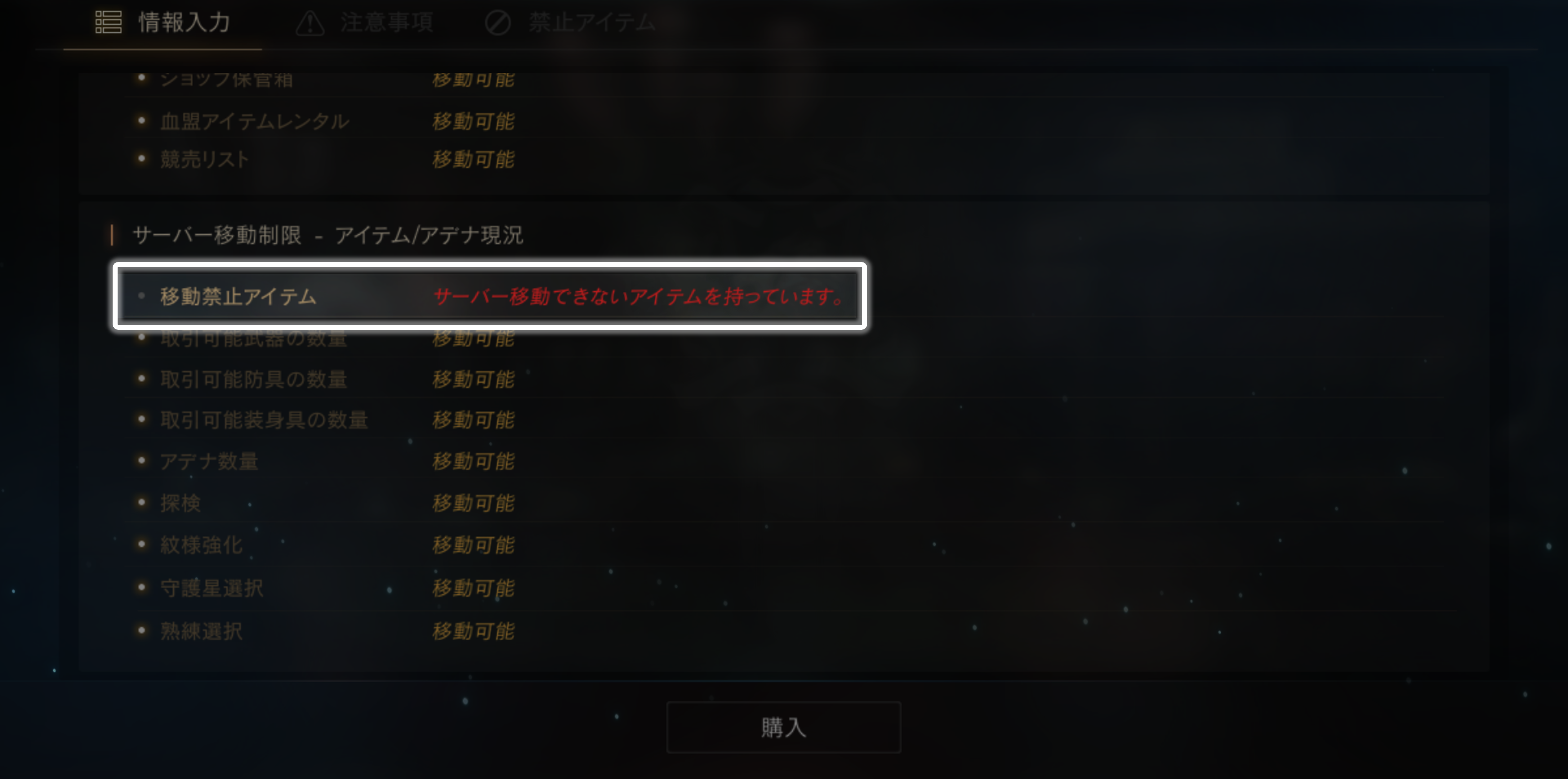 その他下記の場合、サーバー移動券の購入/移動進行が行えなくなります。そのような場合はキャラクターの状態をご確認ください。