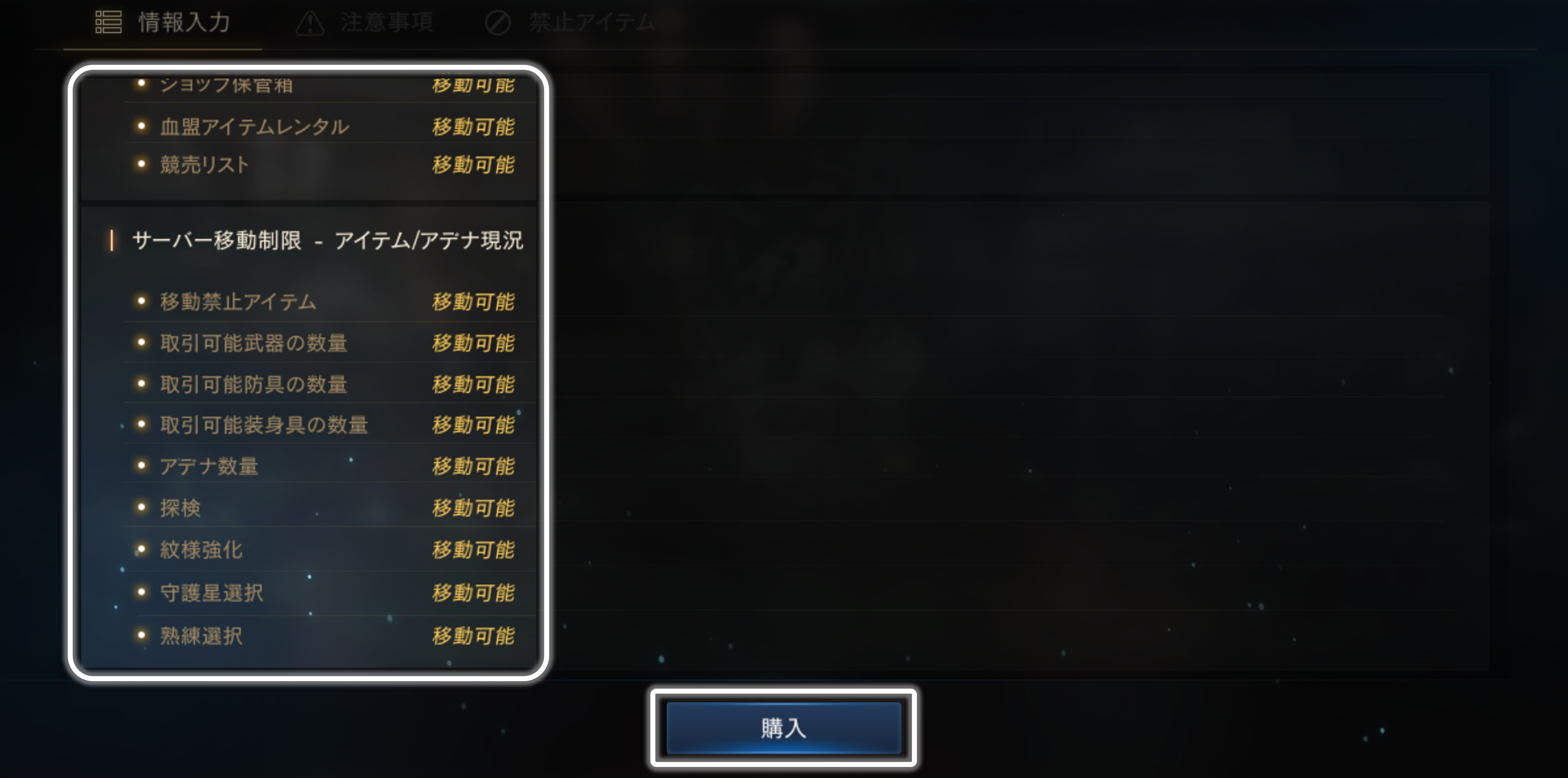 4. 「未受領財貨状況」と「サーバー移動-アイテム/アデナ現況」がすべて移動可能になっていることを確認し、最下部の購入ボタンを押してください。