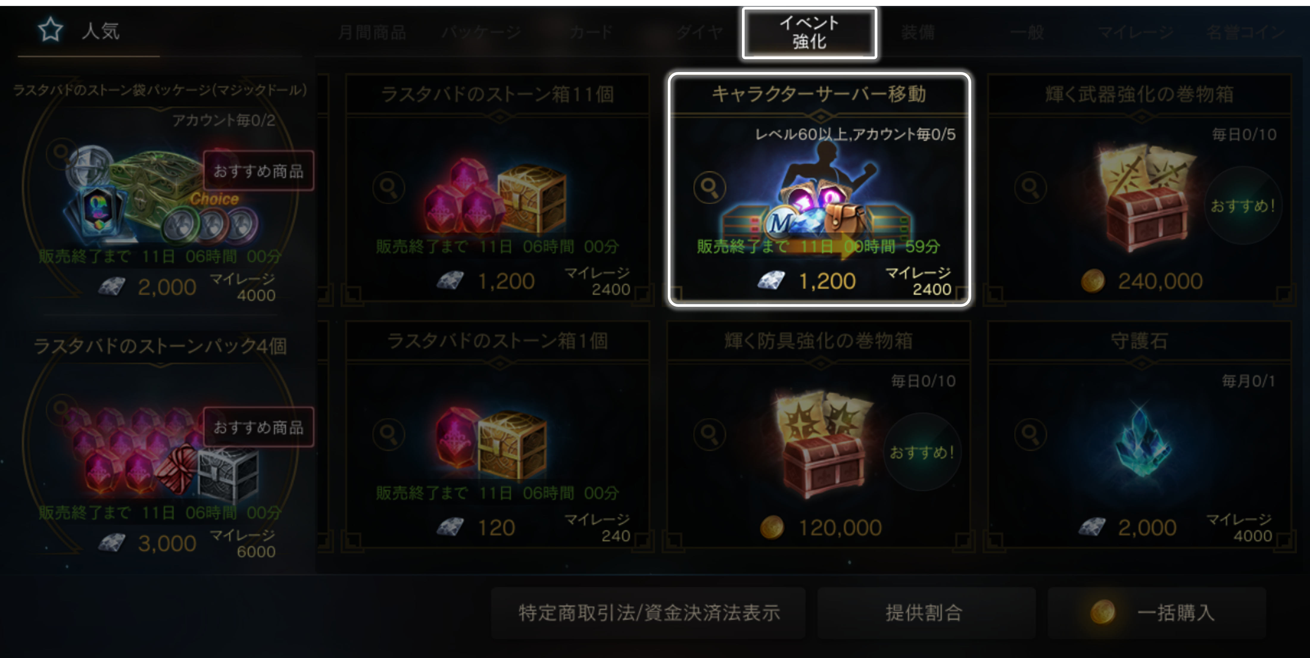 1. メニューからショップを選択し、「イベント/強化」タブ>「キャラクターサーバー移動」を選択します。