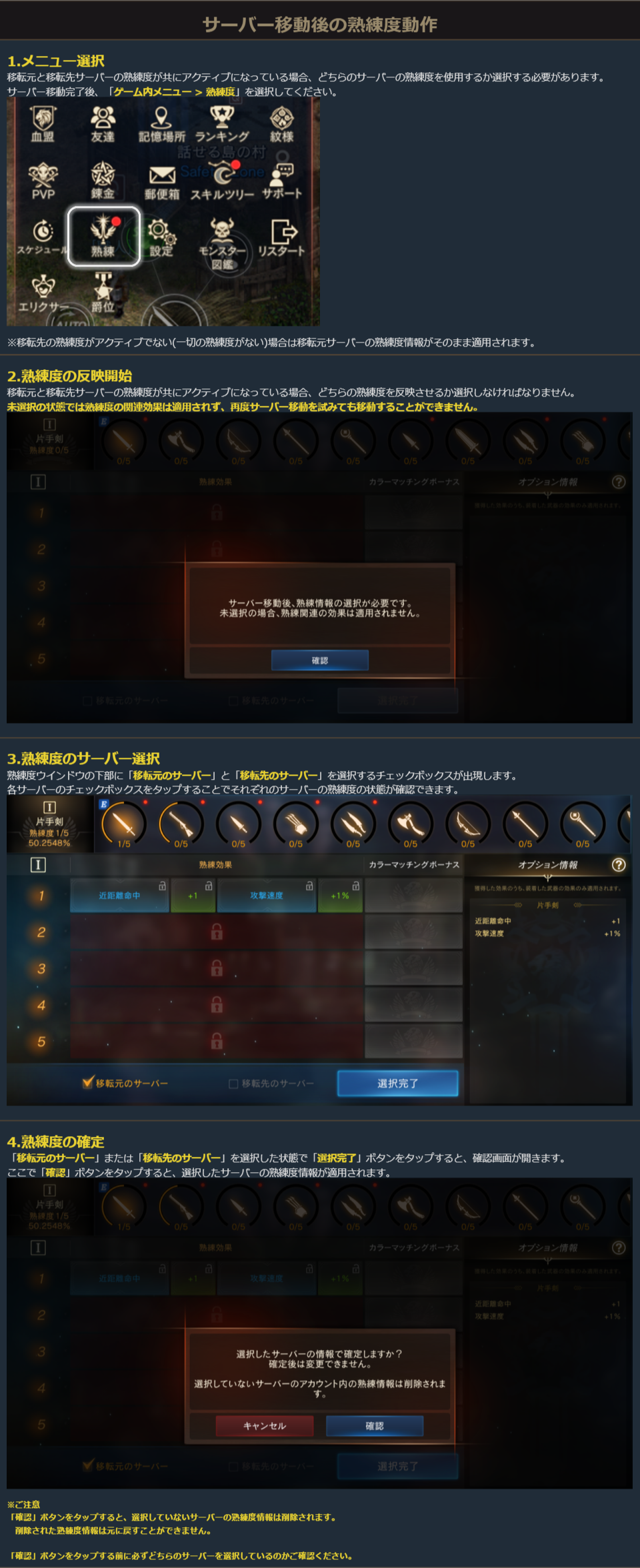 ・サーバー移動後に到着したサーバーのキャラクターで「メニュー>熟練」より移動前と移転先サーバーどちらかの熟練度を選択する必要があります。