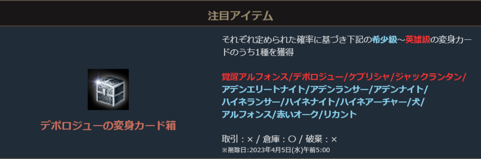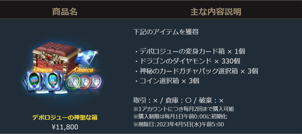 複数の「神秘のカードガチャパック選択箱」「コイン選択箱」「ドラゴンのダイヤモンド」に加え、特定の希少級~英雄級変身カードからなるリスト内のうち1種を獲得できる「デポロジューの変身カード箱」が入った毎月購入可能なパッケージです。