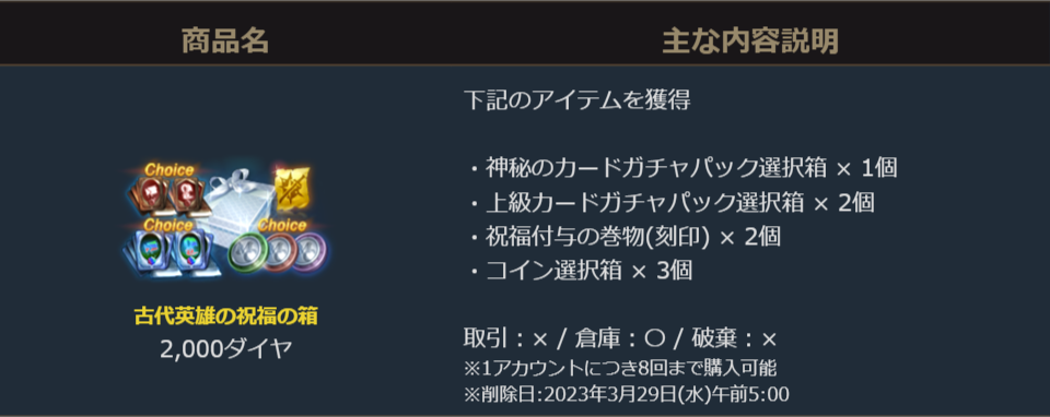 2023年3月11日より販売を開始しました「古代英雄の祝福の箱」のご案内を申し上げます。