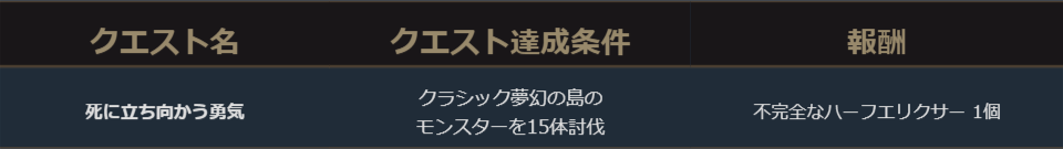 クラシック夢幻の島で進行可能なクエストをクリアし「不完全なハーフエリクサー」を集める事で「ハーフエリクサー(帰属)