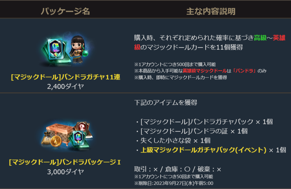 獲得可能な英雄級マジックドールが「パンドラ」のみになった特別なガチャ「[マジックドール]パンドラガチャ11連」の単品販売に加え、同一効果を持つアイテム「[マジックドール]パンドラガチャパック」に、集めることでパッケージ販売期間終了後に様々な製作に使用できる「[マジックドール]パンドラの証」や消耗品アイテムがセットになった「[マジックドール]パンドラパッケージ」の2種類の商品が登場しました。
