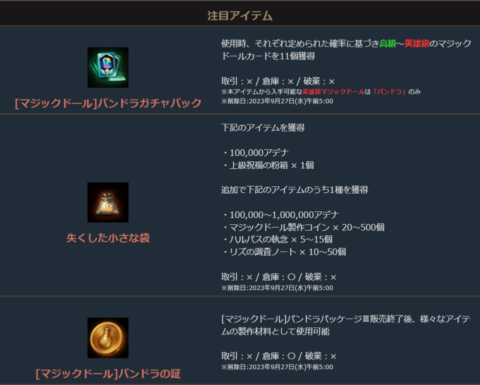 ※対象者の方へ郵便にて配布いたします「上級マジックドールガチャパック(イベント)」の受取期限は2023年9月27日(水)5:00までとなります。