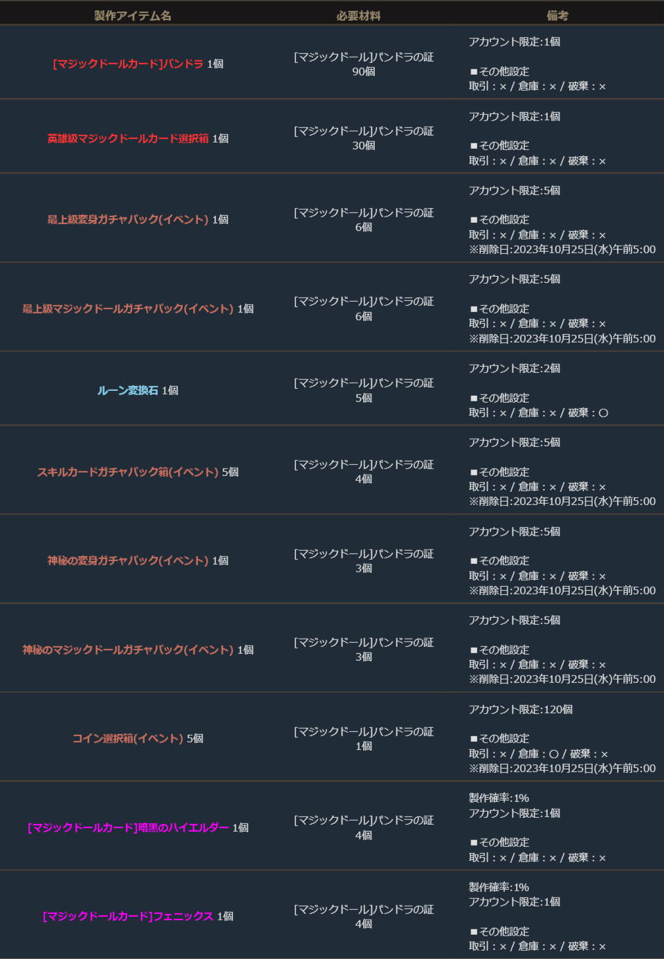・5月中旬の第2回販売時に予定しておりました「[マジックドール]パンドラの証製作アイテム一覧」を追記致しました。