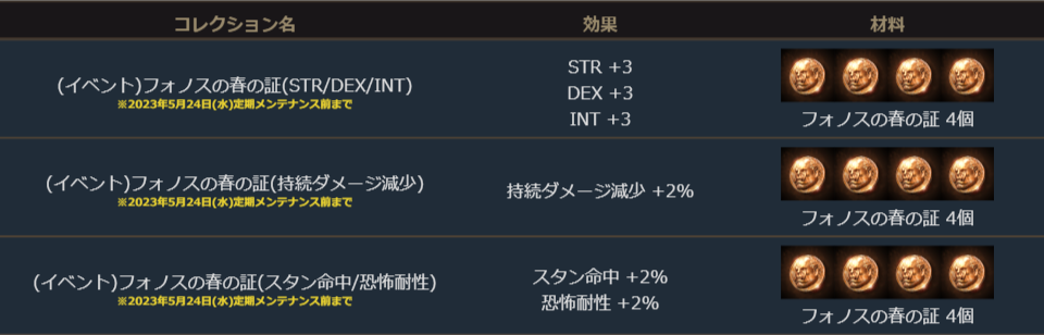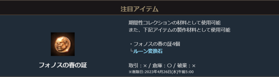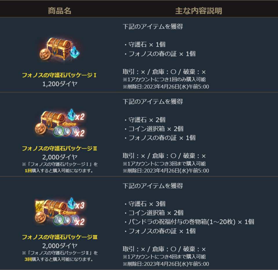「守護石」と期間性コレクションへの登録や製作に使用できる「フォノスの春の証」を中心としたステップアップパッケージです。
