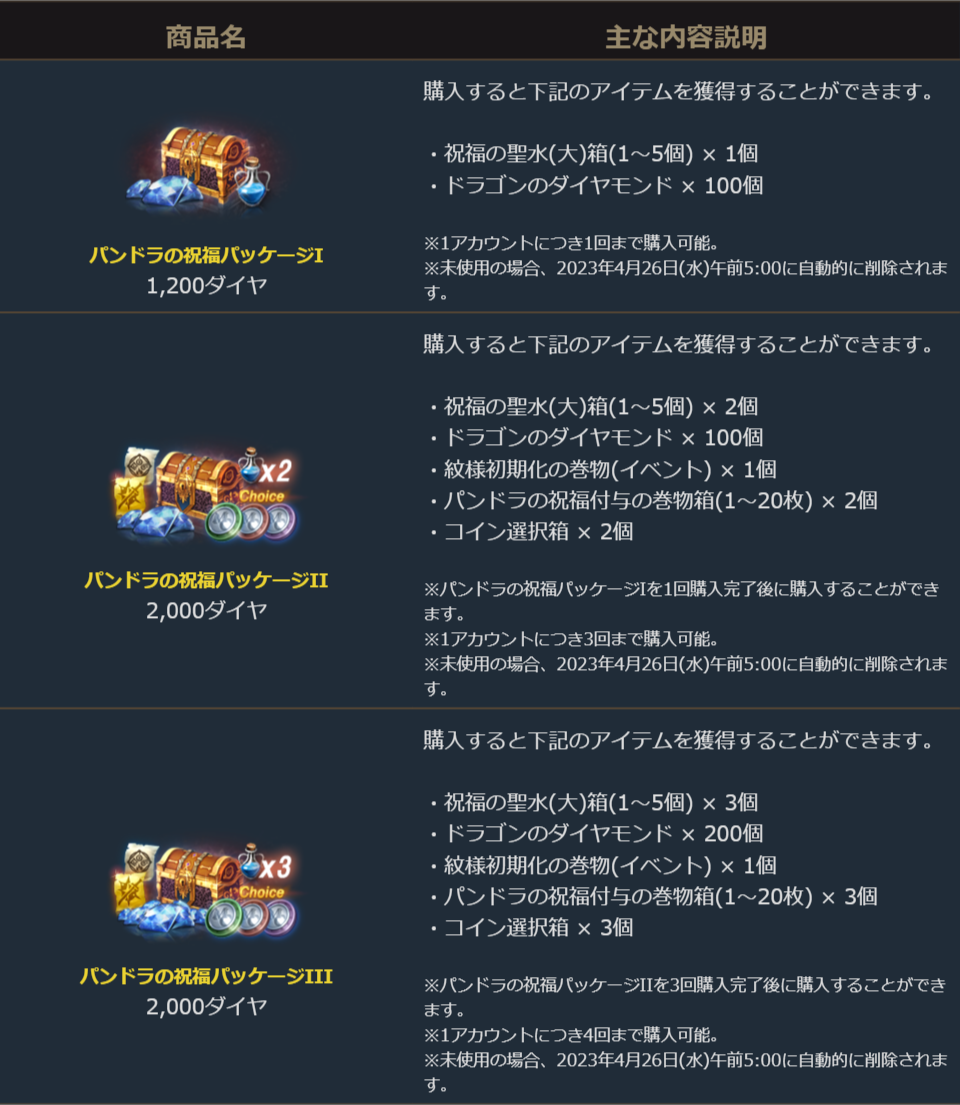 「祝福の聖水(大)箱(1~5個)」と「ドラゴンのダイヤモンド」のセットから、段階毎に獲得できるアイテムの個数と「パンドラの祝福付与の巻物箱(1~20枚)」や「コイン選択箱」と種類が増えていくステップアップパッケージとなっているお得なパッケージです。
