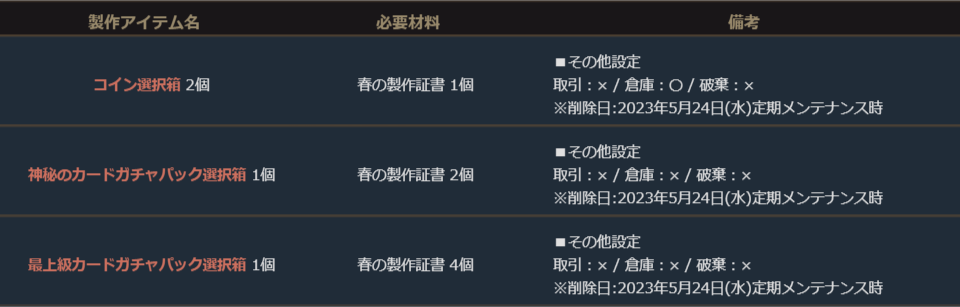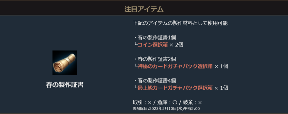 「コイン選択箱」等のアイテムが製作可能になっている「春の製作証書」がセットになったパッケージです。
