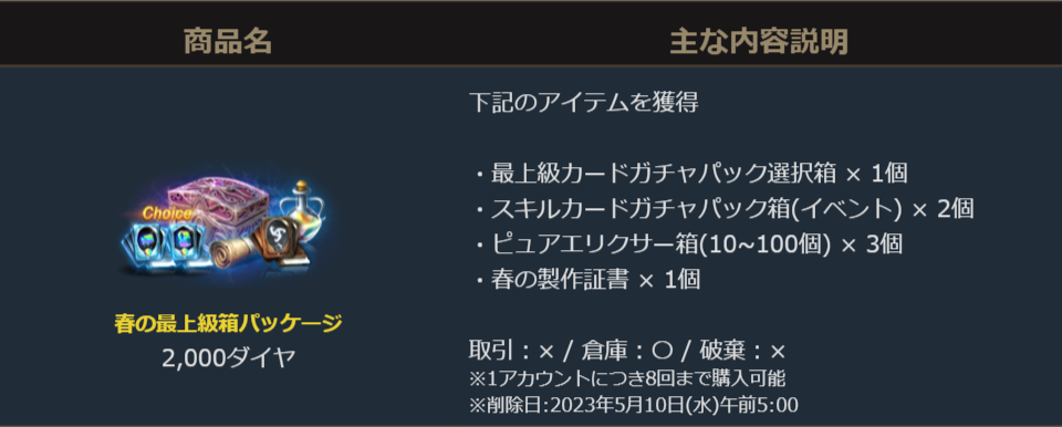 「最上級カードガチャパック選択箱」や「スキルカードガチャパック箱(イベント)」に加えてキャラクターのステータスを上昇させる事が出来る「エリクサー」と