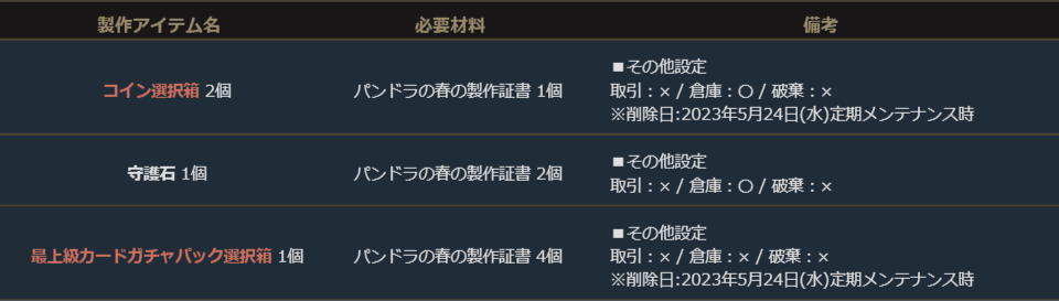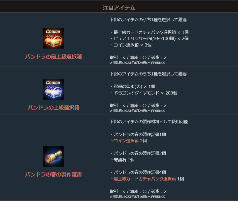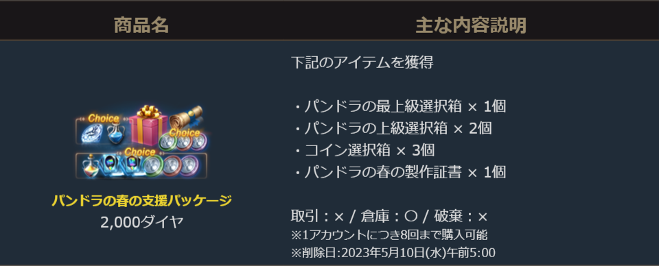 「最上級カードガチャパック選択箱」「ピュアエリクサー箱(10~100個)」「コイン選択箱」から1種を選択して獲得できる「パンドラの最上級選択箱」や「祝福の聖水(大)」「ドラゴンのダイヤモンド」から1種を選択して獲得できる「パンドラの上級選択箱」に加え、付属の「パンドラの春の製作証書」は様々なアイテムが製作により獲得が可能になっており、さらに「コイン選択箱」がセットになったお得なパッケージです。