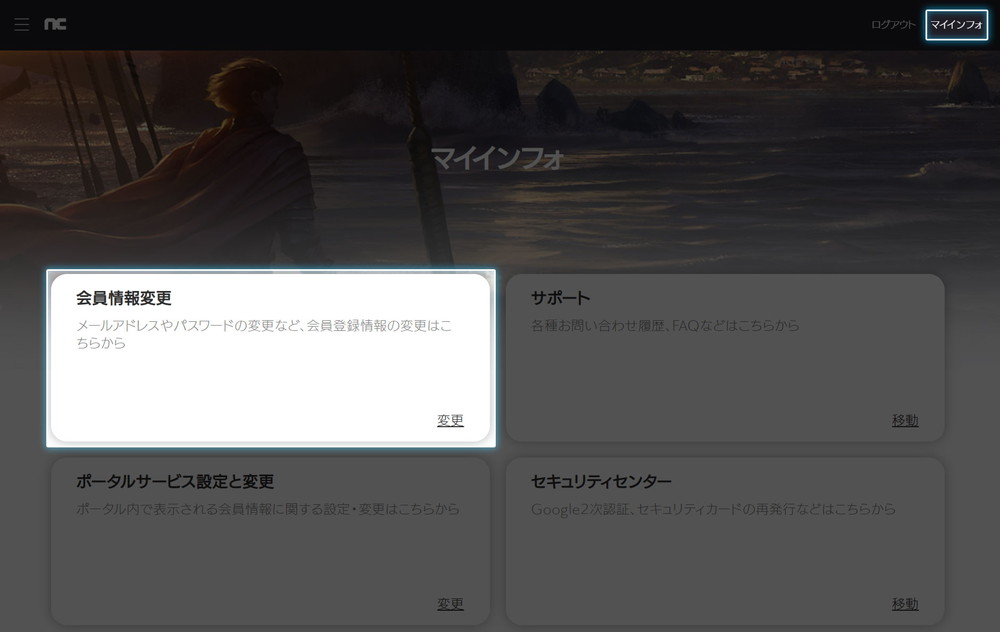 NCSOFTポータルサイトでログイン後は、画面右上よりマイインフォに移動し、画面下部の"会員情報修正"を選択します。