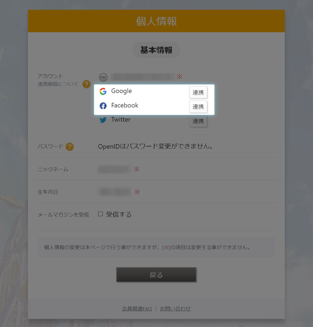 ・現在ログインしているOpen ID(NCSOFTアカウント以外)と同じメールアドレスでご登録いただいているサービス(Google ID、Apple ID、Facebook ID)のみ連携追加が可能です。