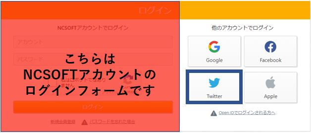 ・Twitter IDに登録されている、もしくは確認用メールアドレスとして使用したメールアドレスでNCSOFTアカウント(メールアドレスログイン)をお持ちの場合は自動的にTwitterアカウントとNCアカウントが連動されます。