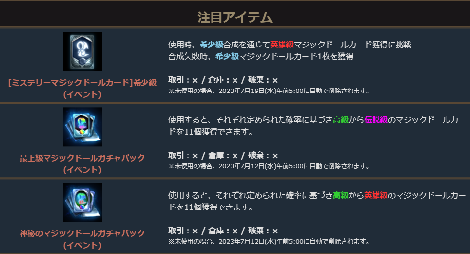 ※一部アイテムが期間終了後も未使用の場合、一定期間が経過すると自動で削除されます。詳しくは各アイテムの詳細をご確認ください。