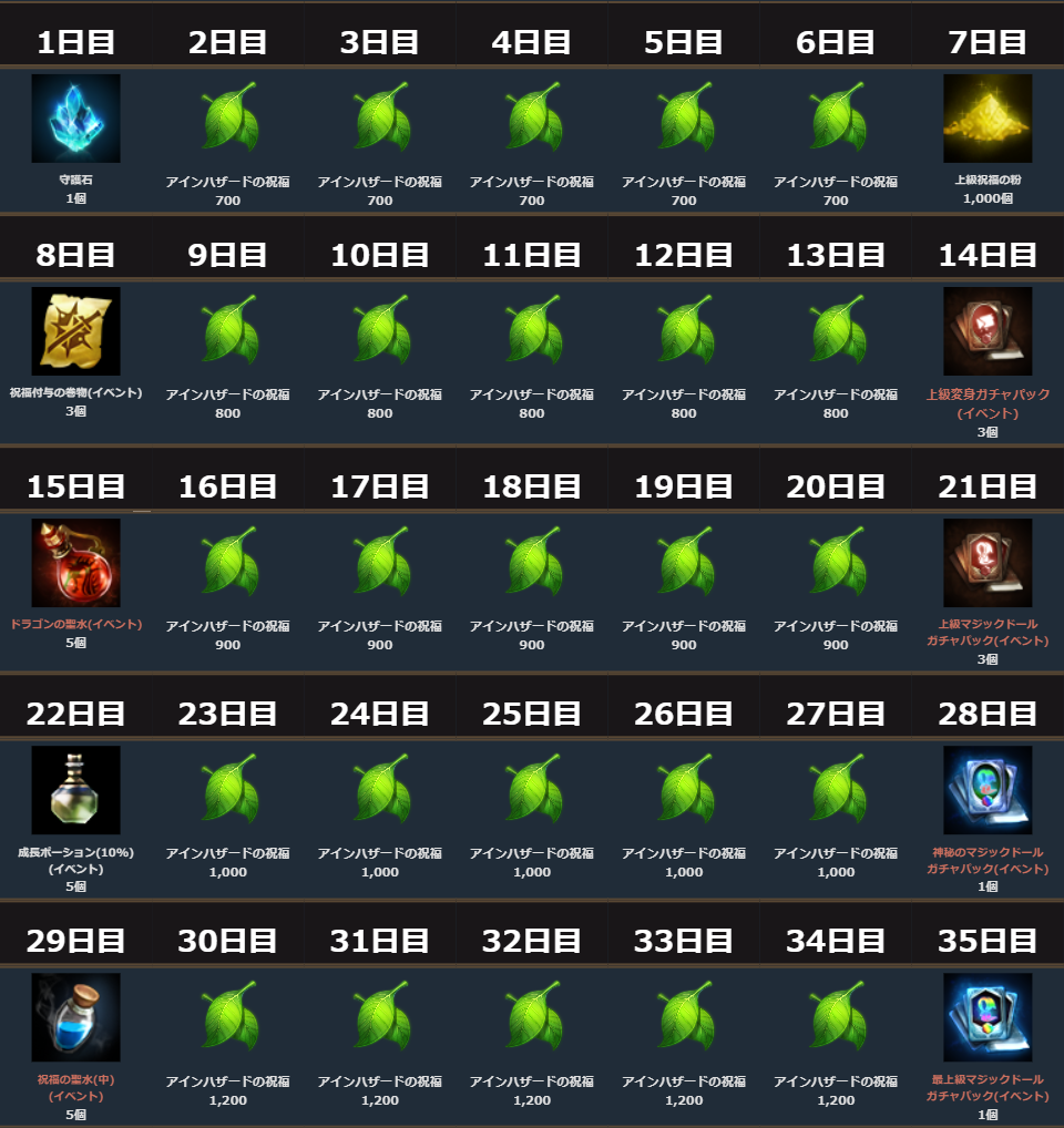 多くのアインハザードの祝福に加え、「守護石」や「上級祝福の粉」などが手に入るほか、35日目には「最上級マジックドールガチャパック(イベント)」が獲得できます。
