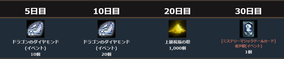 また、連続出席報酬30日目は「[ミステリーマジックドールカード]希少級(イベント)」が獲得できます。