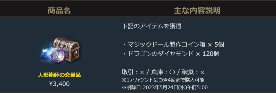 「ドラゴンのダイヤモンド」とあわせて貴重なコレクションや特別な性能を持つマジックドールの製作の材料として使用可能な「マジックドール製作コイン箱」を沢山獲得できるお得なパッケージです。