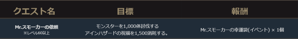 イベント期間中、毎日イベント専用クエスト「Mr.スモーカーの依頼」が配信されます。
