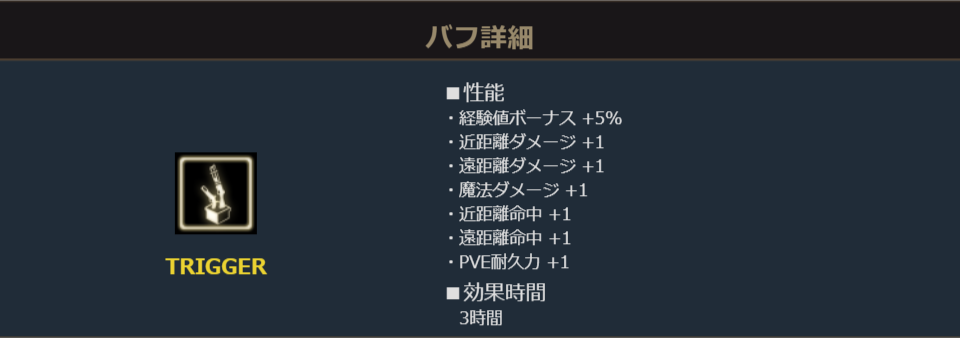 また、イベント期間中は「ギラン村」「傲慢と信念の塔入口」「忘れられた島」「悲嘆の洞窟」「支配の塔入口」にイベントNPC「TRIGGER」が登場します、イベントNPCを調べる事で特別なバフを獲得できます。
