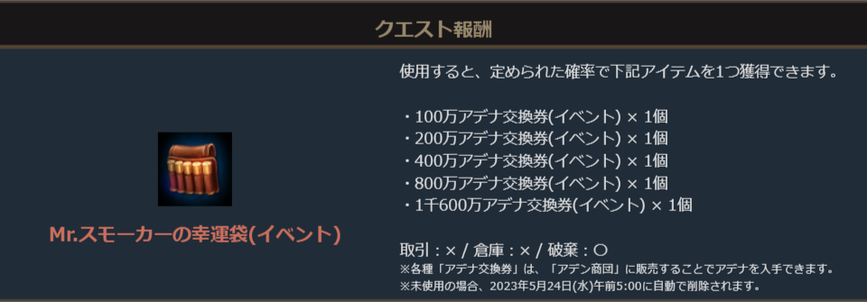 Mr.スモーカーの依頼を達成し報酬のイベントアイテム「Mr.スモーカーの幸運袋」を獲得しましょう!